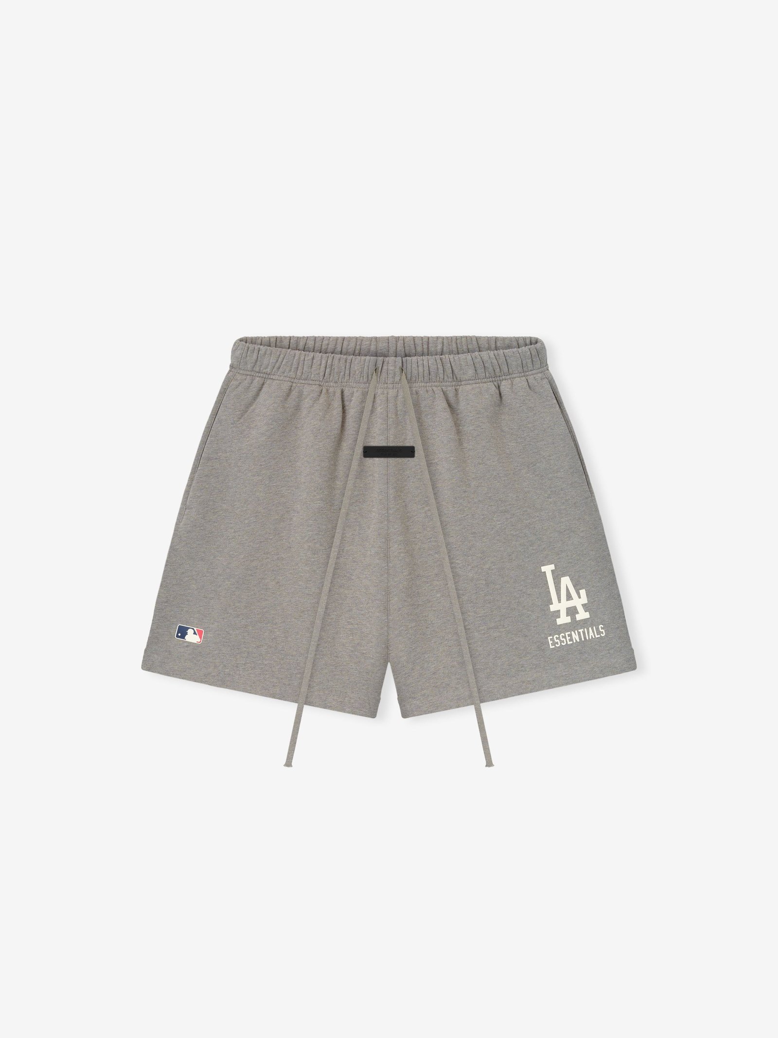 The Dodgers Classic Sweatshort is made in 380gsm core fleece to provide body and structure to a relaxed fit. An L.A. Essentials puffer print lockup and MLB logo are branded on legs. Additional details include an encased elastic waistband with elongated drawstrings, and side pockets. A Fear of God Essentials rubberized label is stitched on the center front.
