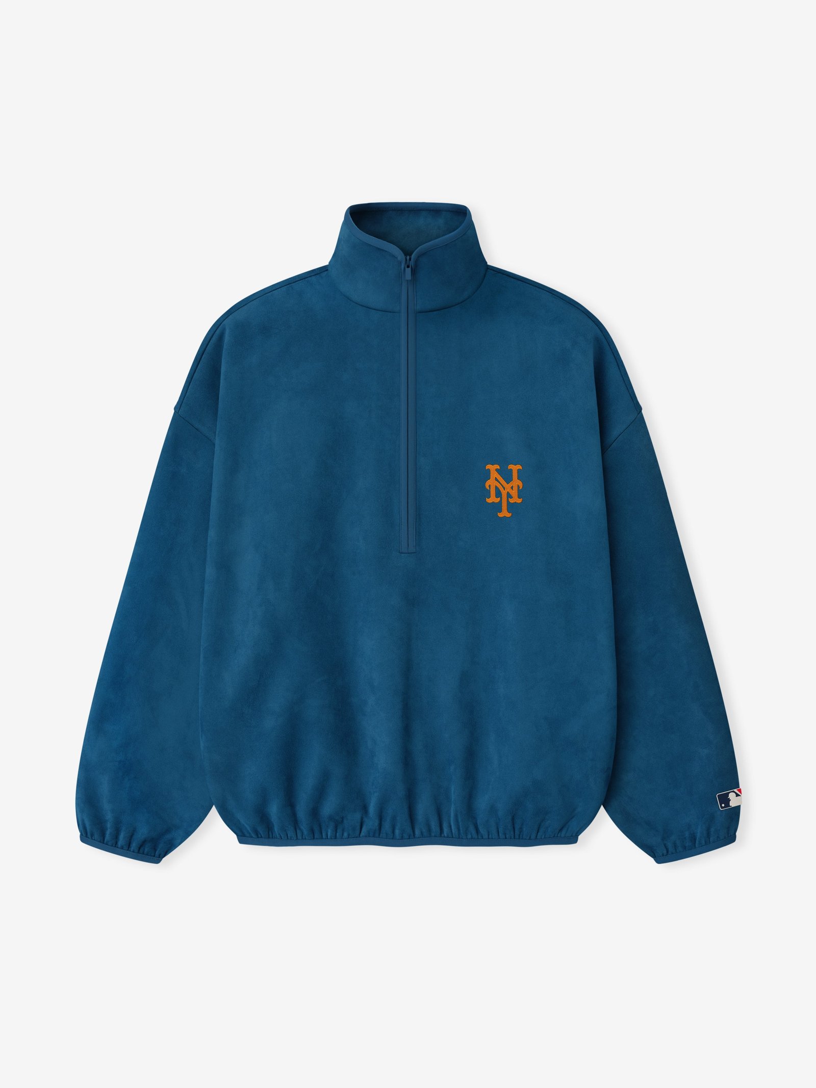 The Mets Sport Half Zip is crafted from suede fleece, offering a plush, suede-like hand feel that enhances its vintage-inspired style. Designed in a relaxed Sport fit with satin-stitch branding, the front features the iconic New York Mets logo, while the back showcases a New York Essentials script lockup. Additional details include the MLB logo on the sleeve, side pockets, and elastic binding at the hemlines. The look is finished with the signature Fear of God Essentials label at the back collar.