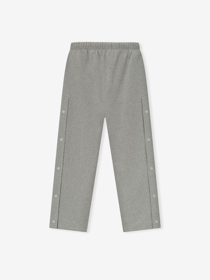 The NBA Tearaway Sweatpant is crafted from 380gsm core fleece, offering both structure and body to its voluminous wide-leg silhouette with metal snap hardware. The leg features NBA ESSENTIALS puff-print lockup paired with the official NBA logo. Finishing details include an encased elastic waistband with elongated drawcords, side seam pockets, and a Fear of God Essentials rubberized label stitched at the center front.