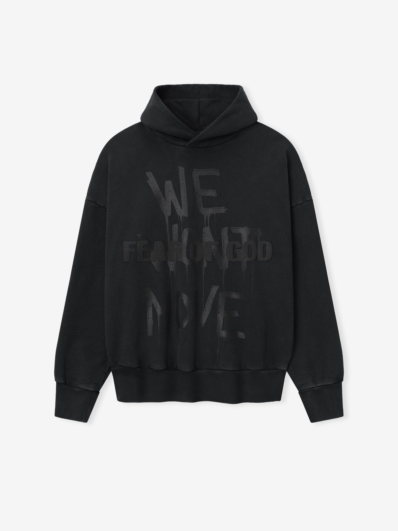 The We Won’t Move Hoodie is crafted in the USA from 100% cotton fleece and is designed with a vintage fit for a shrunken, cropped style. It features hand-printed graphics inspired by the Civil Rights movement. The piece undergoes garment washing, sun fading, and hand-vintaging treatments to achieve an authentic, time-worn appearance. Additional details include rib-knit cuffs, ribbed waist hem, and a Fear of God label.