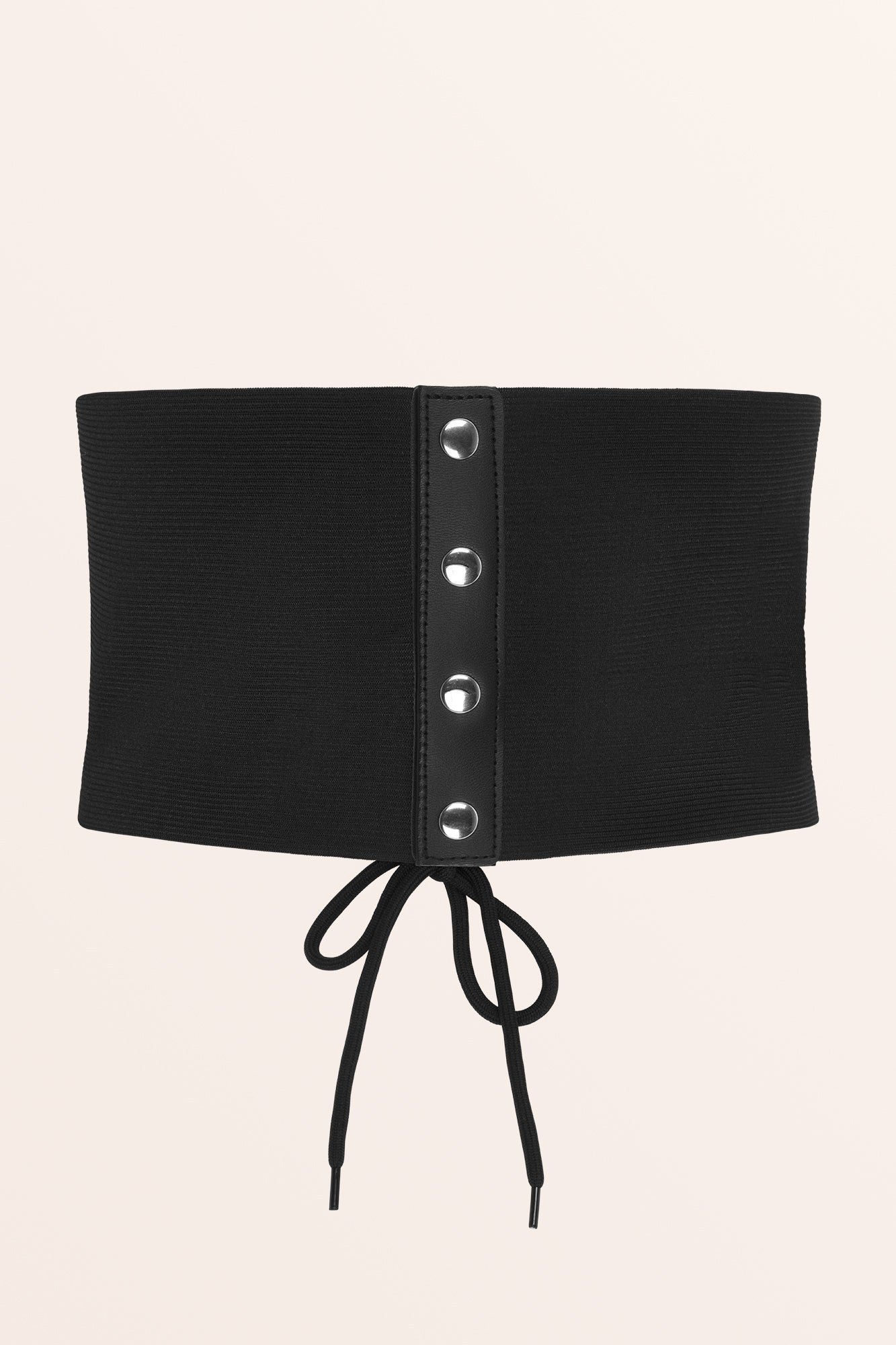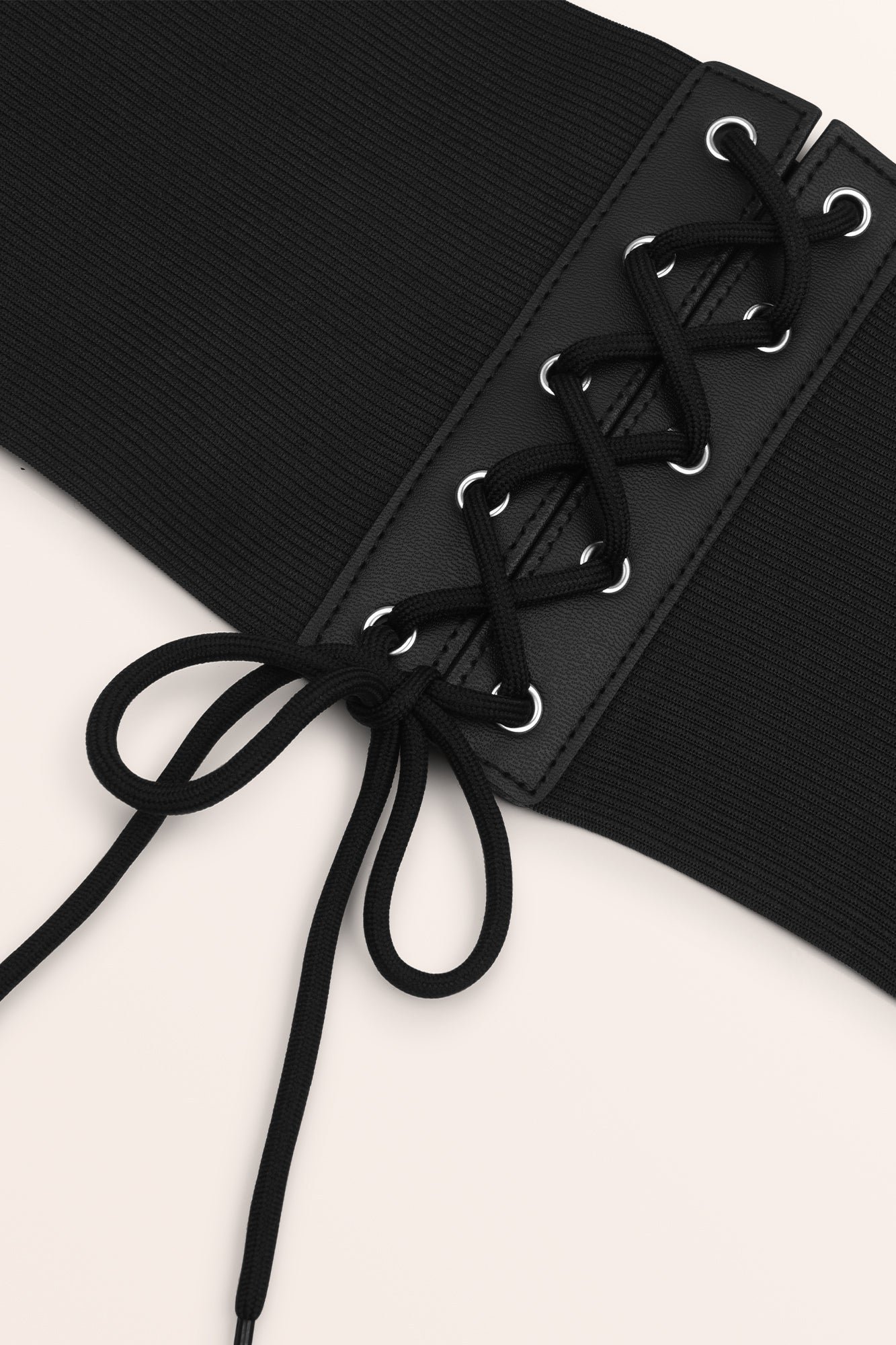 This 5.5 inch wide corset lace up waist belt has a press button fastening one side and shoe string lace up on the other side. The belt can be worn either way, front or back. As the material is stretchy elastic with an adjustable corset style lace up, it will adjust to many different sizes. This fashion forward waist belt is sure to provide a great asset to your wardrobe!