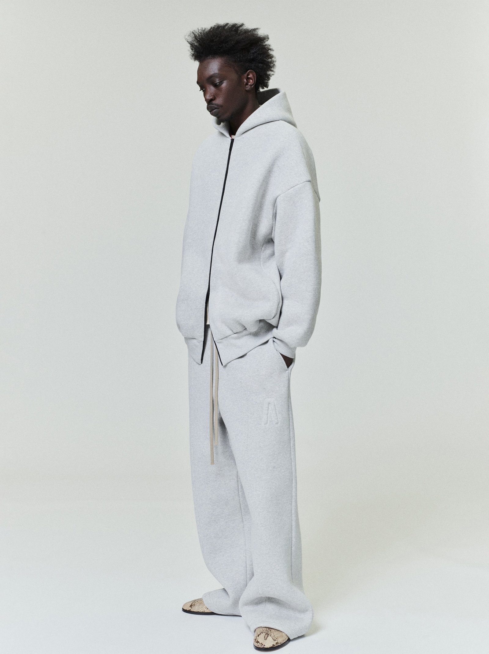 The Athletics Full Zip Hoodie is crafted in Portugal from heavy cotton blend fleece for robust structure. The branding is minimal, featuring an embossed “A” for Athletics and a Fear of God label. This double-layer hoodie features a relaxed fit with drop shoulders, side pockets, rib-knit cuffs and waist-hem.